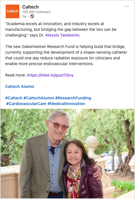 A recent Caltech post on their LinkedIn page features the story behind the Gakenheimer Research Fund, Dr. Gakenheimer’s most recent contributions dedicated to supporting our novel cardiovascular catheter technology. This fund will help us advance our technology into bridging the gap from a lab prototype to a clinical grade device. The entire team is incredibly grateful for Dr. Gakenheimer’s continued support. See the post on [LinkedIn].